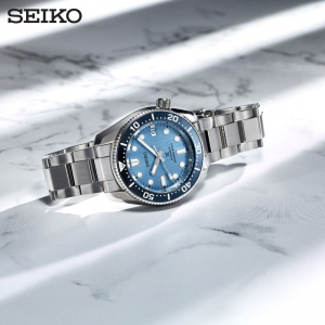 SEIKO PROSPEX 1968 DIVER’S SAVE THE OCEAN SPECIAL EDITION รุ่น SPB299J นาฬิกาที่ได้รับแรงบันดาลใจมาจากนาฬิกาดำน้ำปี 1968 หรือที่แฟนๆ เรียกว่า Marine Master นำเสนอในรูปแบบหน้าปัดสีฟ้า ที่มาพร้อมลวดลายภูเขาน้ำแข็งบริเวณทวีปแอนตาร์กติก สีฟ้าสื่อถึงการก่อตัวของภูเขาน้ำแข็งที่ใช้เวลานานหลายสิบล้านปี ยิ่งระยะเวลาก่อตัวนานเท่าใดสีของน้ำแข็งก็จะเข้มขึ้นเท่านั้น ดังนั้นนาฬิกาดำน้ำปี 1968 ถือเป็นรุ่นที่สองของคอลเลคชั่น จึงมีสีฟ้าอ่อนลงมาจากรุ่นก่อนหน้านี้
